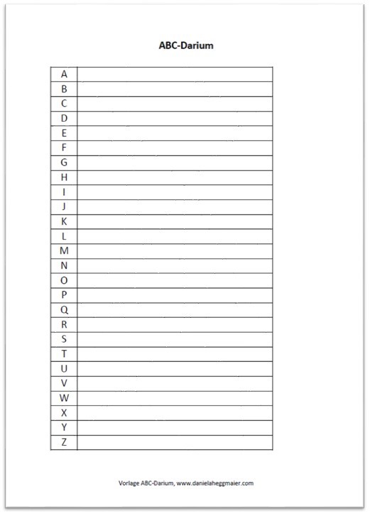 Wie das geht? Nehmen Sie ein leeres Blatt. Schreiben Sie alle Buchstaben des Alphabets von oben nach unten auf. Oder verwenden Sie diese kostenlose Vorlage für das ABC-Darium: